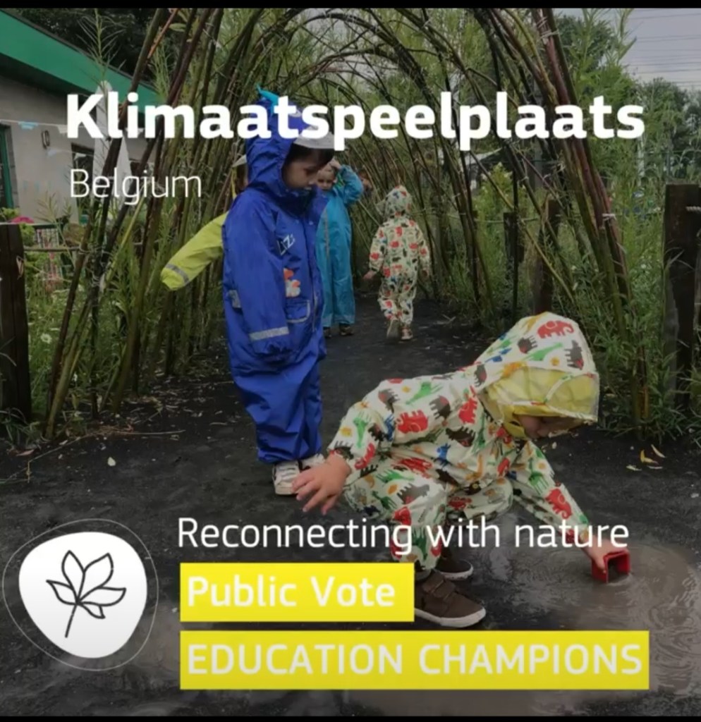 Meester Cedric mocht gisteren in naam van de school de New European Bauhaus Award van de Europese Unie in ontvangst nemen. Het project Klimaatspeelplaats behaalde er uit 1450 Europese projecten de hoofdprijs van 30 000 euro in de categorie Education Champions. De publieksstemming stuwde ons speelplaatsproject naar de eindzege.