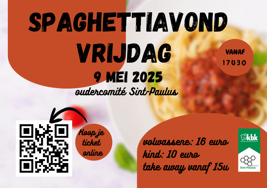 Op vrijdag 9 mei organiseert het oudercomité haar jaarlijkse spaghettiavond. U kunt inschrijven via deze link.