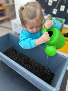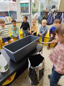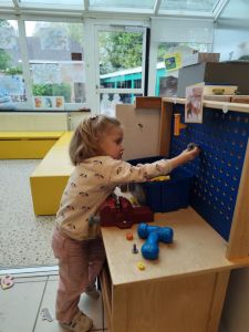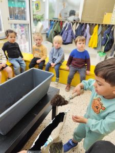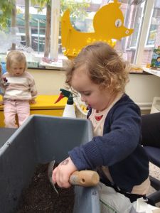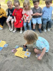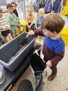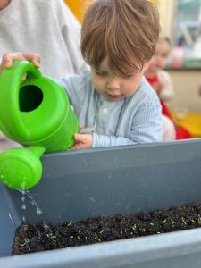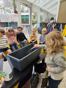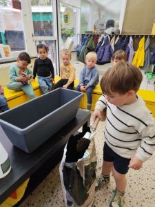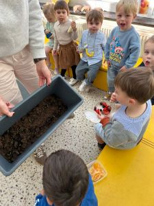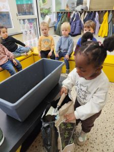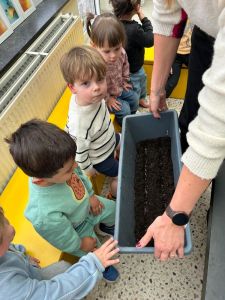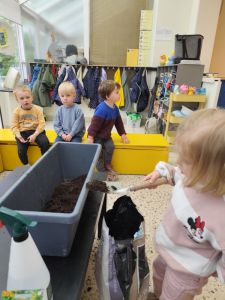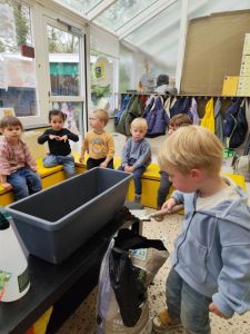 We hebben onze woordenschat ook wat verrijkt door te zaaien in de klas. Zaaien, zaadjes, planten, water geven met een gieter, hark, aarde… Uw peuter is een tal van nieuwe woorden rijker. Door goed voor onze zaadjes te zorgen zagen we ze iedere dag groeien en bloeien. De peuters aanschouwen dit met grote ogen. Ook namen we de tijd om (buiten in ons tuintje) adhv een spelletje te weten te komen wat nu wel en niet goed is voor onze bloemetjes. We kwamen overeen dat erop